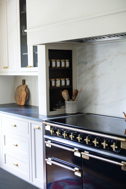 We also created a little butler’s pantry for prep and extra storage with beautiful mosaic tile and metallic sconces.